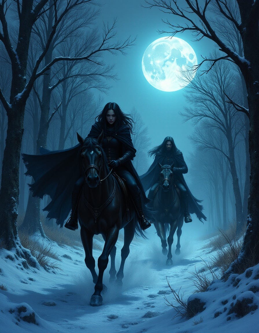 We turned our horses from the tavern, dark thoroughbreds stamping against the snow. A pale blue orb drifted over Suzanne’s shoulder, washing the thatched roof in cyan glow and throwing long, uneasy shadows as we cantered away.